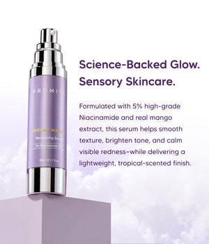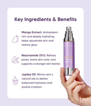 Formulated with 5% Niacinamide and antioxidant-rich Mango Extract, this serum supports a visibly brighter, more even complexion in just 14 days. Niacinamide helps regulate oil, reduce the appearance of pores, and strengthen the skin barrier—while Mango Extract defends against environmental stressors and boosts glow.